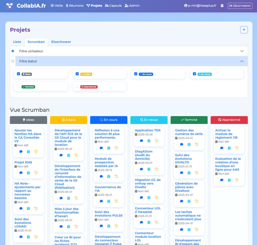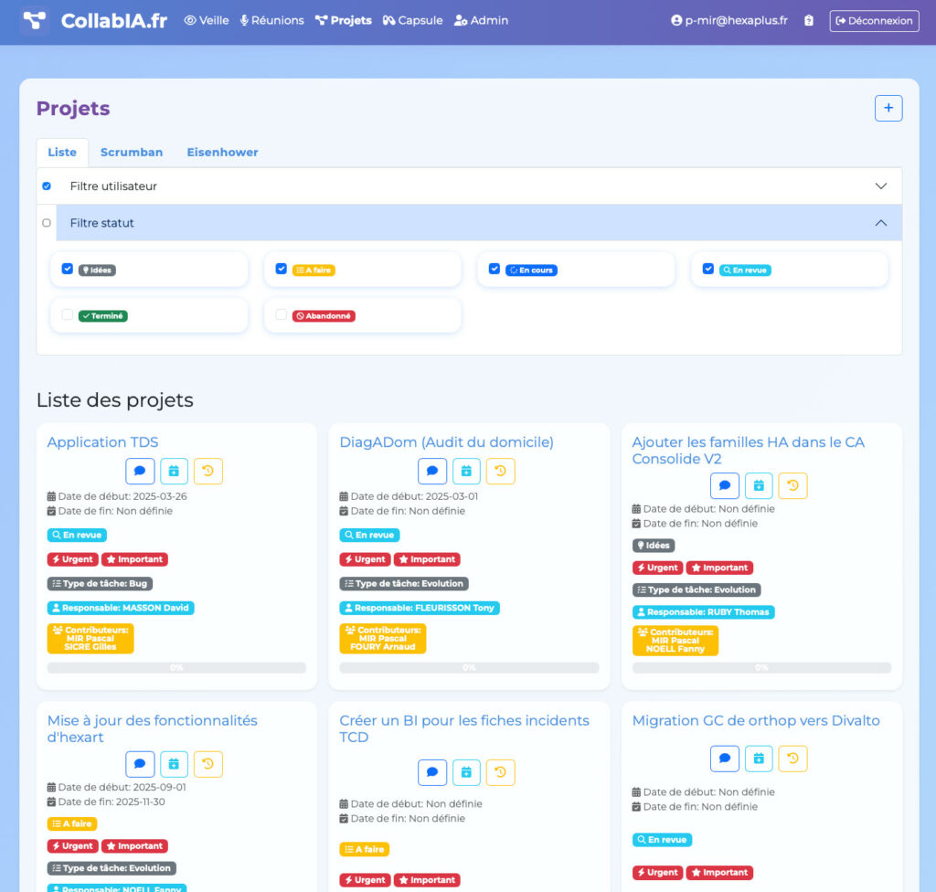 La plateforme propose également une gestion avancée des projets et des tâches, avec la prise en charge de projets et sous-projets, le suivi des statuts, des priorités, des échéances et des charges de travail. Les responsables et contributeurs peuvent piloter l’activité à l’aide de visualisations dédiées, telles qu’une vue Scrumban configurable par organisation ou une matrice d’Eisenhower facilitant la priorisation stratégique.